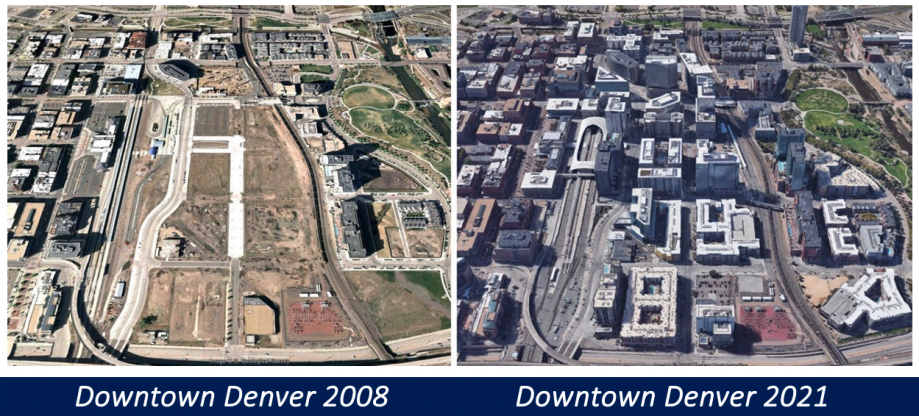 Indeed. Denver’s Union Station project has been an incredible growth catalyst for the city, bringing new prosperity to huge parts of downtown. When Denver’s planners came up with the idea for revitalizing the station, they believed optimistically that additional development spurred on by the station would add 9,000 residents to the area and perhaps 110,000 jobs. By 2017, the midpoint of their plan horizon of 2027, the area had already seen 22,800 residents move in to buildings around the station, and there were 133,500 jobs – 21 percent employment growth compared with the 16 percent planners projected, and 153 percent residential growth.